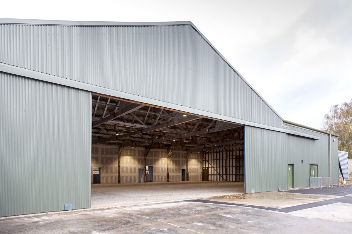 The WWI aircraft hangar, built around 1915, is Grade II listed, meaning the structural repairs to the timber work and the replacement of the wall- and roof-cladding required the utmost care.